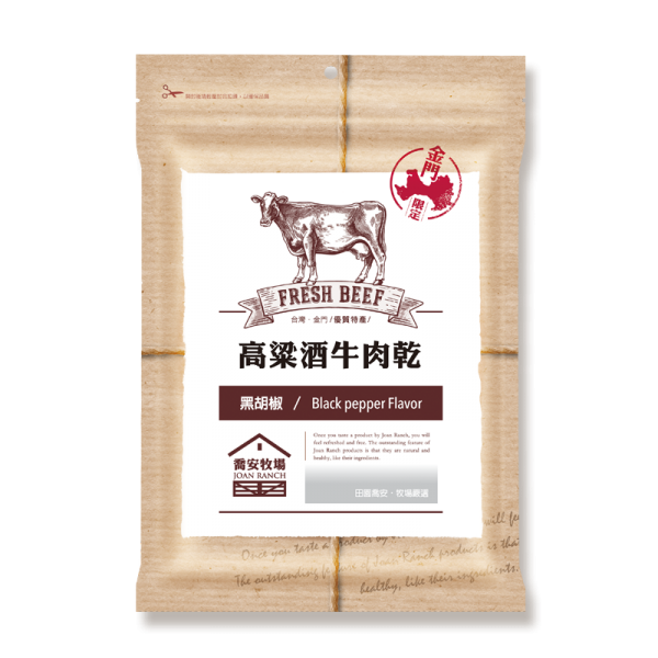 『金門限定版牛肉乾』使用牛的肩胛里肌部位,肌肉發達,細筋多,肉質軟嫩適中,保留牛肉的筋脈與纖維,呈現美麗的楓葉紋路,再加上獨特配方,搭配多種辛香料熬煮,長時間滷煮烘烤,堅持經過細火烘炒及高溫烘烤多道程序,入口牛肉香醇風味,讓人允指回味!