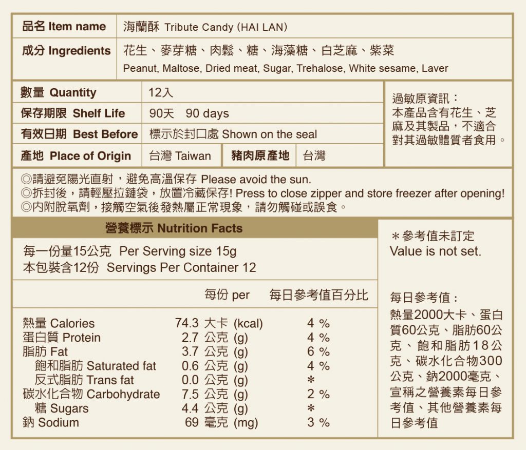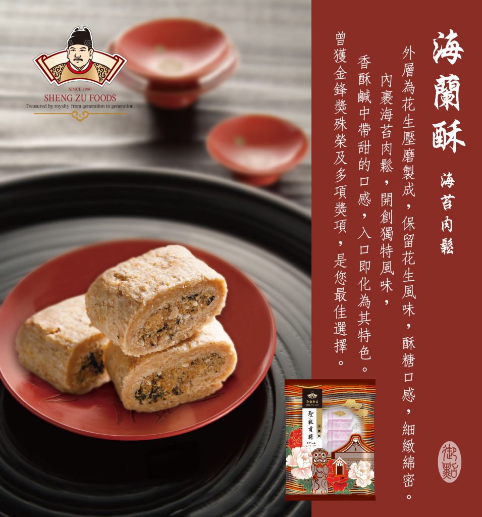 榮獲全國《第十六屆金牌獎》。海蘭酥外層酥糖,內餡包裹海苔肉鬆,口感甜中帶鹹,鹹中帶香,入口香酥鬆軟。