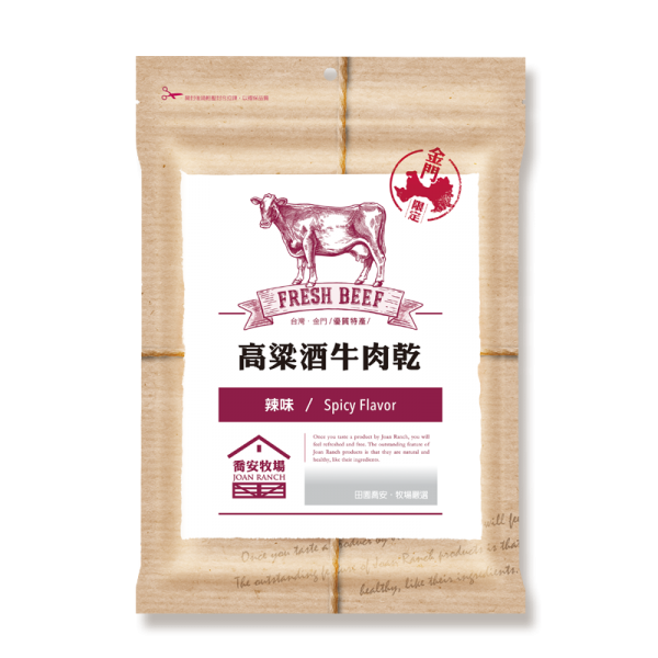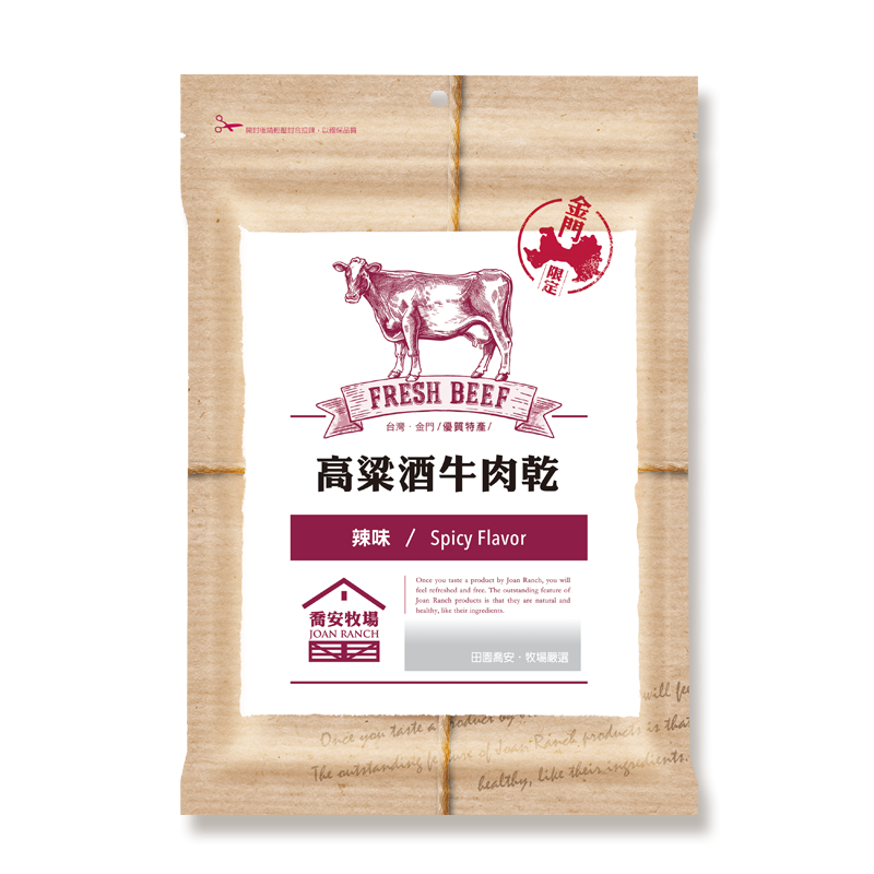 『金門限定版牛肉乾』使用牛的肩胛里肌部位,肌肉發達,細筋多,肉質軟嫩適中,保留牛肉的筋脈與纖維,呈現美麗的楓葉紋路,再加上獨特配方,搭配多種辛香料熬煮,長時間滷煮烘烤,堅持經過細火烘炒及高溫烘烤多道程序,入口牛肉香醇風味,讓人允指回味!